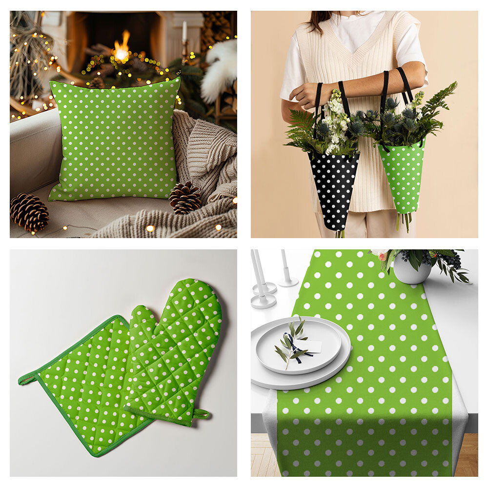 Popis Bavlnená látka, vzor 10 mm biela bodka na zelenom podklade, metráž 160 cm