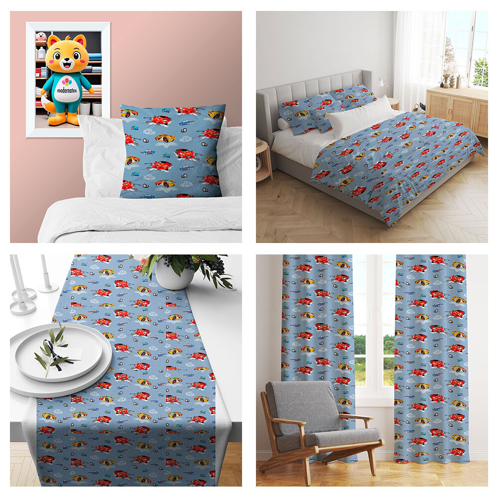 Popis Bavlnená látka vzor auto sport, modrý podklad, metráž 160 cm