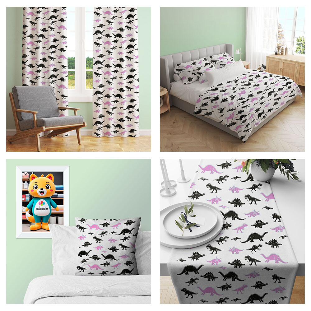 Popis  Bavlnená látka, vzor dino čierno-fialový, metráž 160 cm
