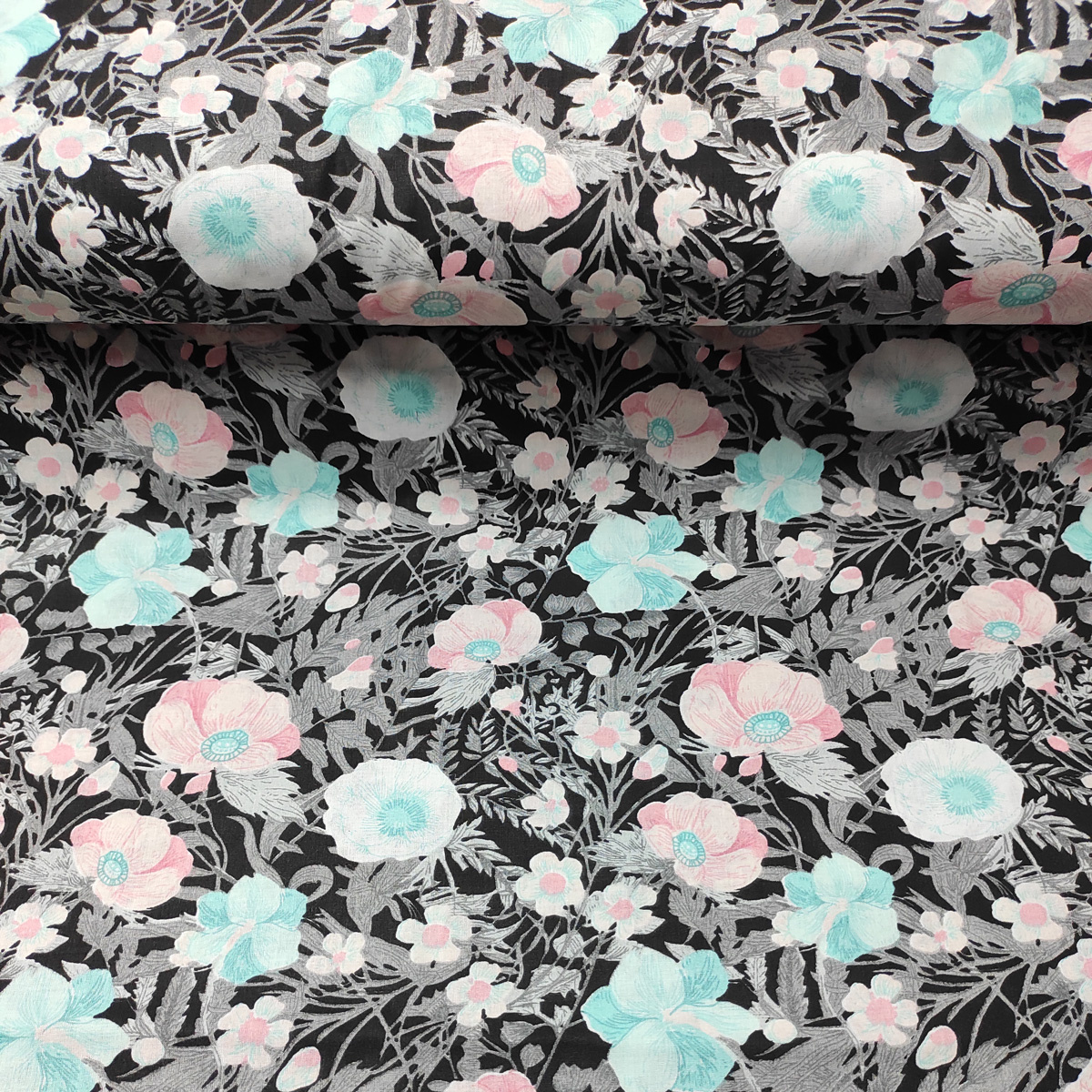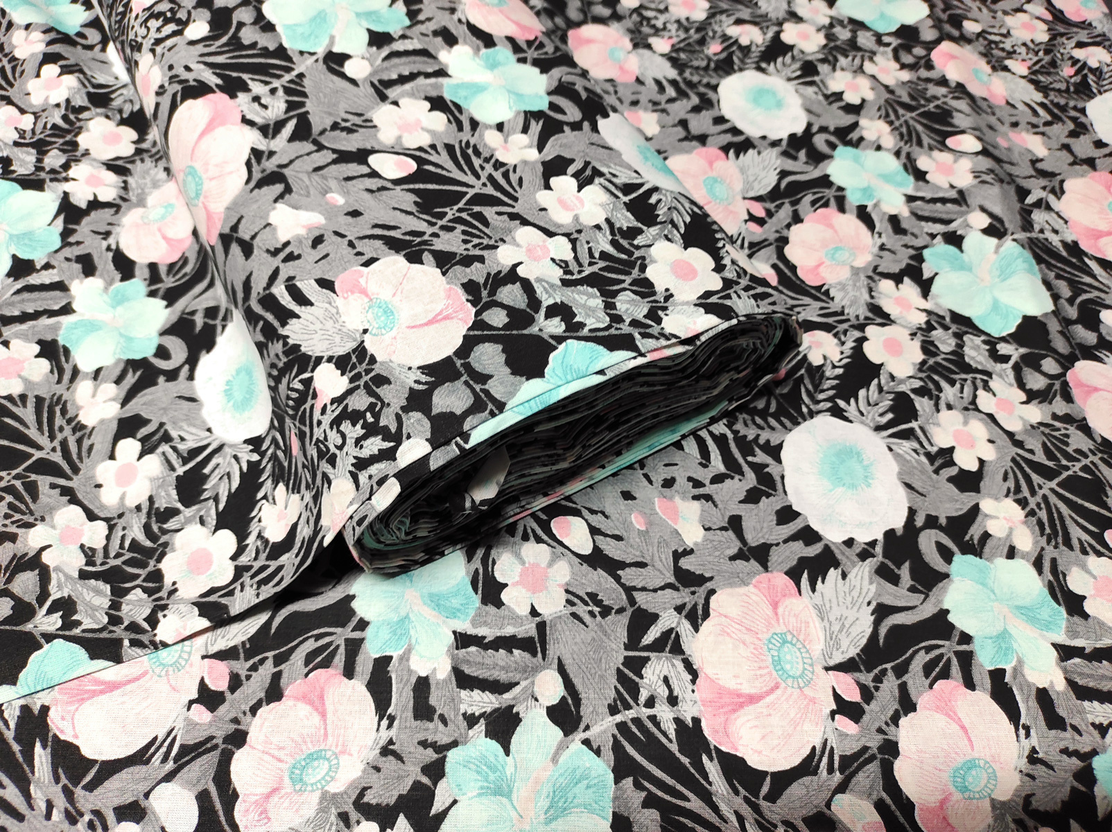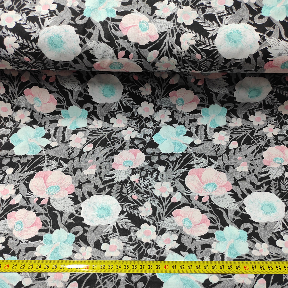 Popis Bavlnená látka vzor kvetiny na čiernom podklade, metráž 160 cm