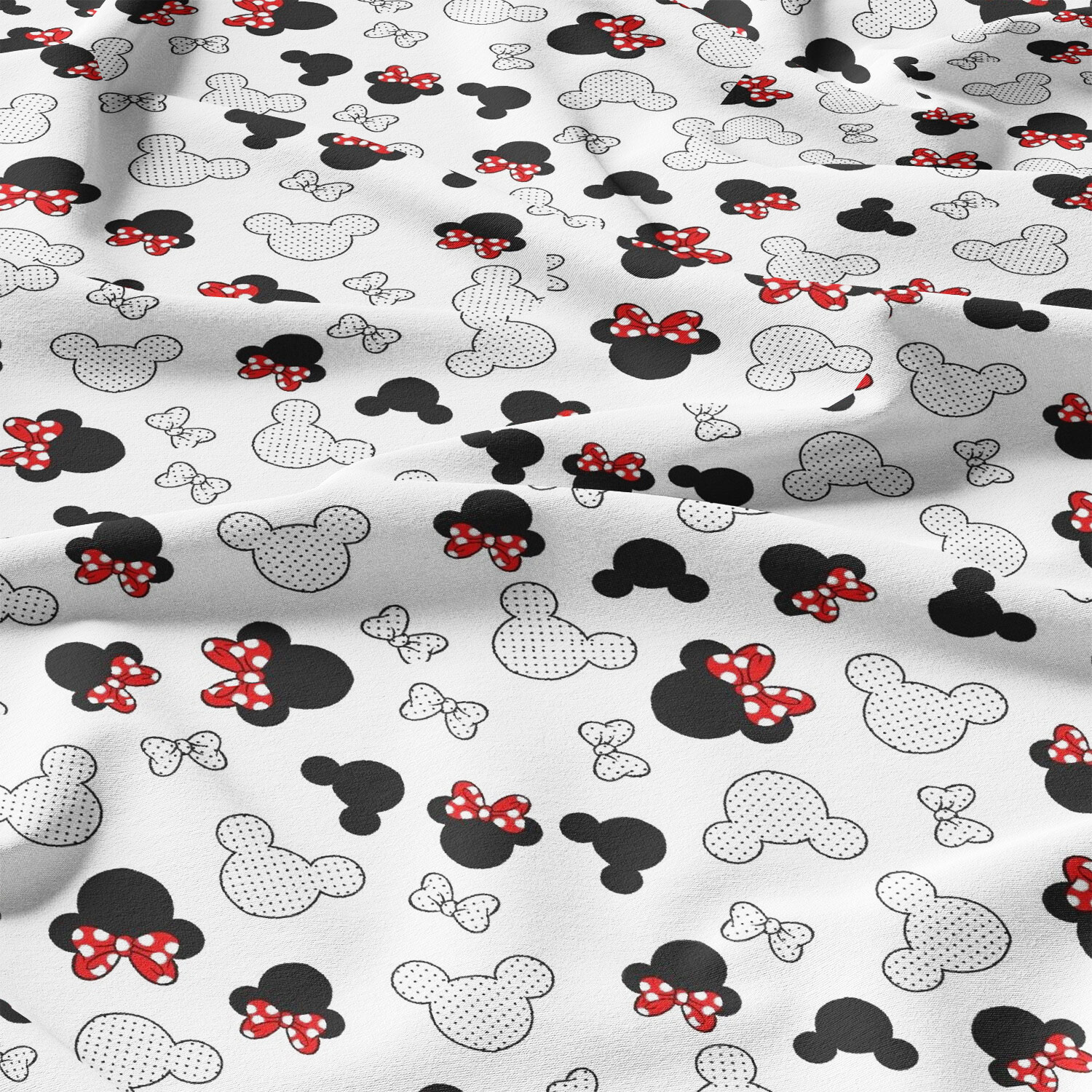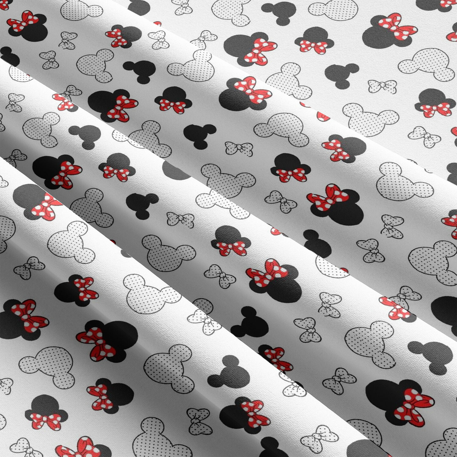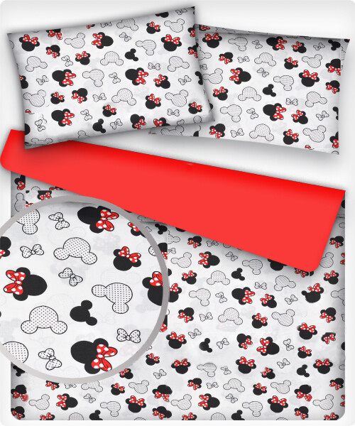Popis Bavlnená látka, vzor miky a červoné kokardy na bielom podklade, metráž 160 cm