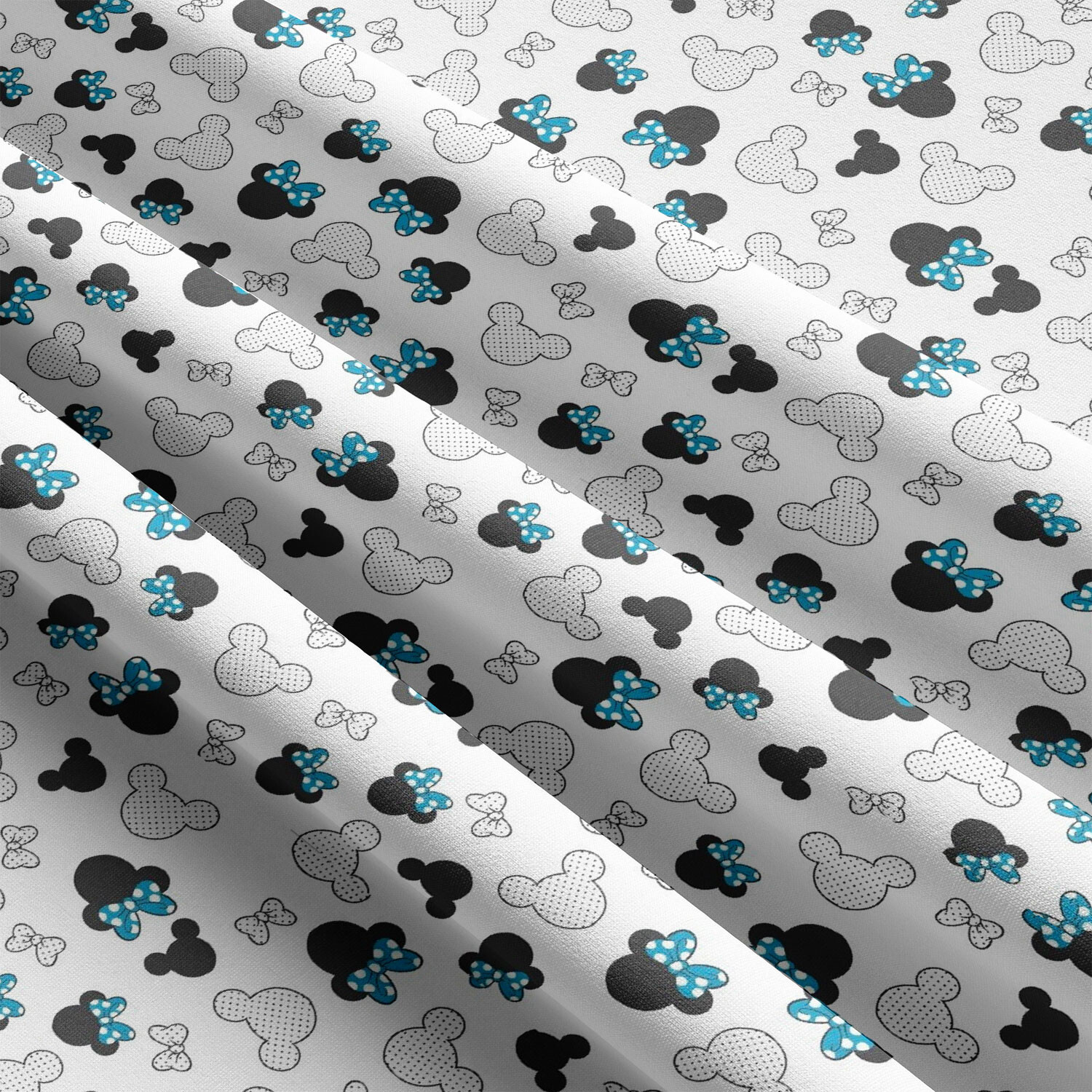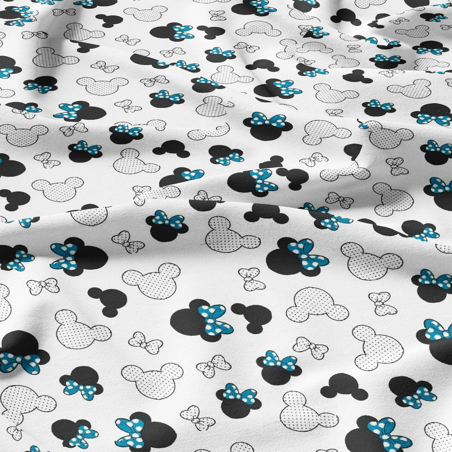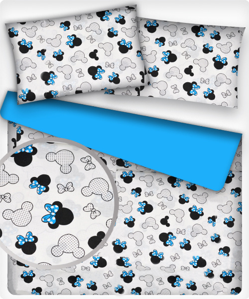Popis Bavlnená látka vzor miky a modré kokardy na bielom podklade, metráž 160 cm
