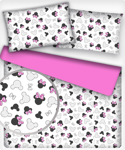 Popis  Bavlnená látka, vzor miky a ružové kokardy na bielom podklade, metráž 160 cm
