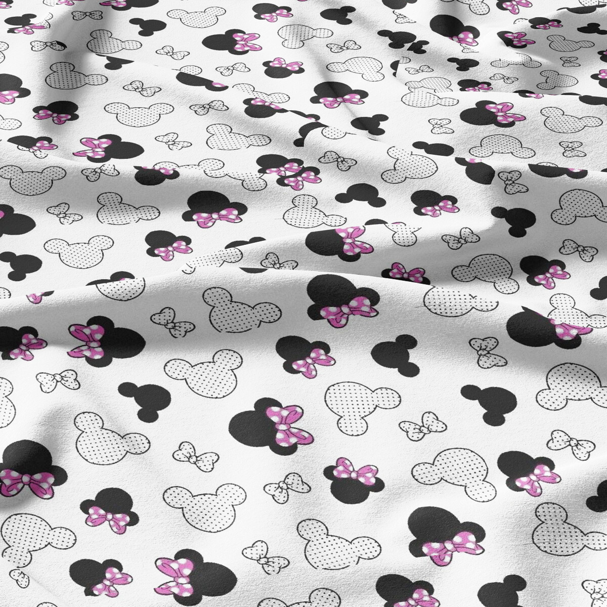Bavlnená látka, vzor miky a ružové kokardy na bielom podklade, metráž 160 cm