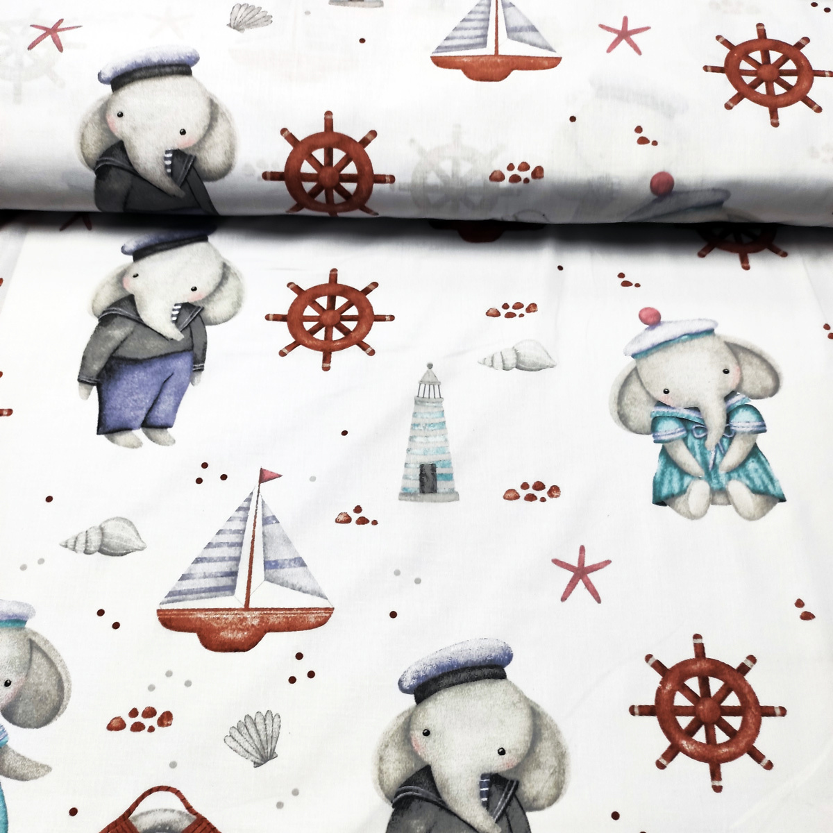 Bavlnená látka vzor Slony a kormídlo na bielom 690