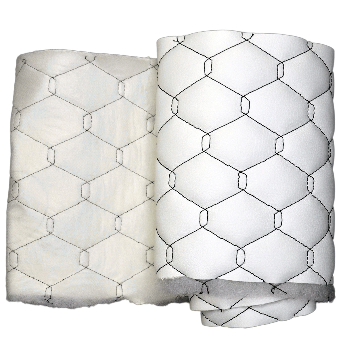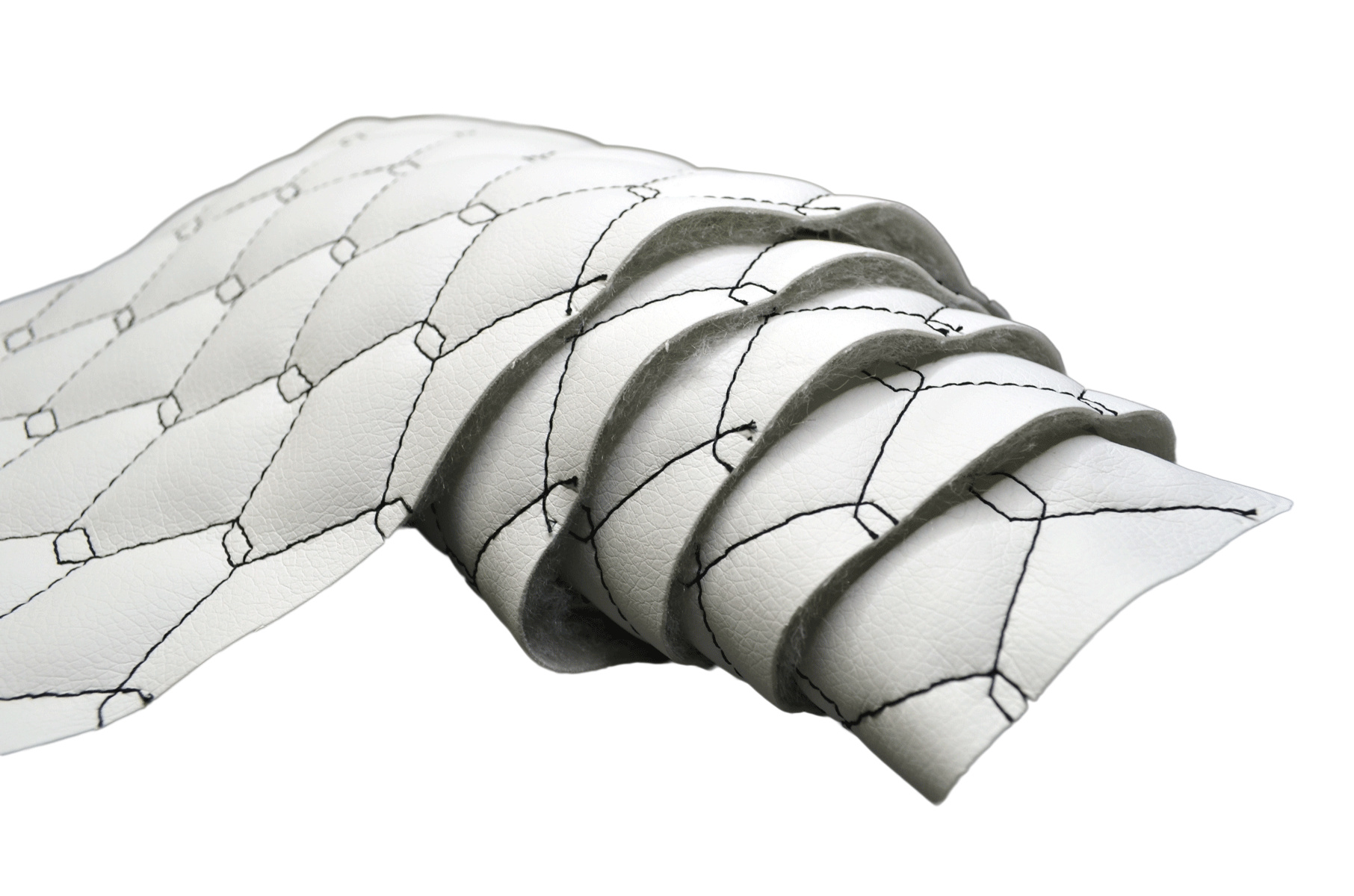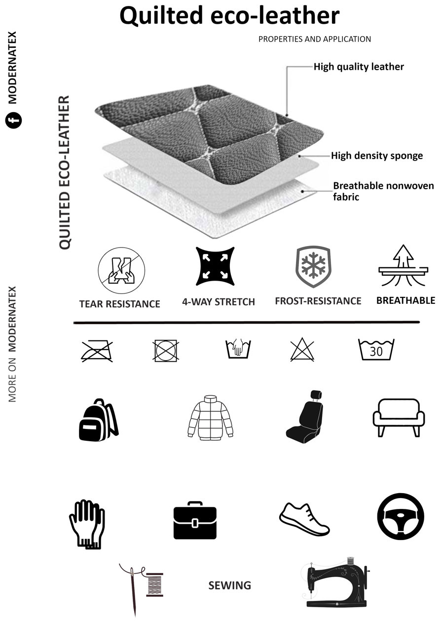 Popis materiálu. Prešívaná ekokoža s polyuretánovým povrchom a polyesterovým základom je moderný čalúnnický materiál, ktorý vyniká elegantným vzhľadom, vysokou odolnosťou a univerzálnym použitím. Štruktúrovaný povrch s dekoračným vzorom 5×5 cm dodáva tkanine atraktívny vzhľad a zvyšuje jej praktické vlastnosti.