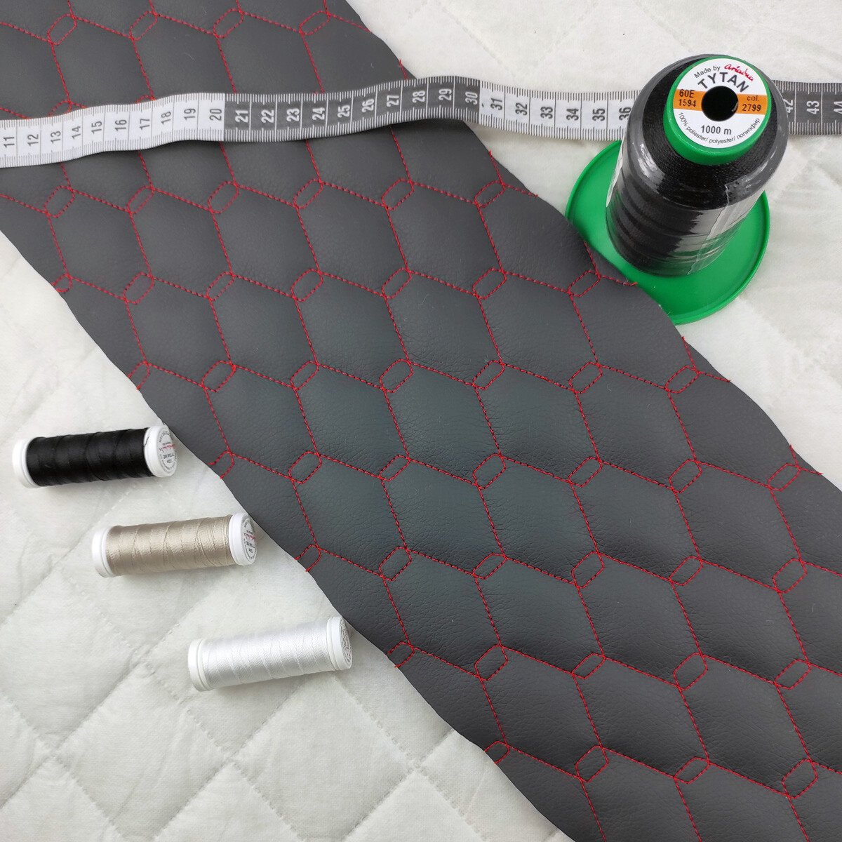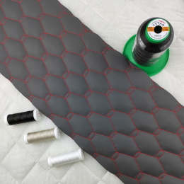 Popis Ekokoža GEO farba grafitovo - červená prešívaná niťami, koženka metráž