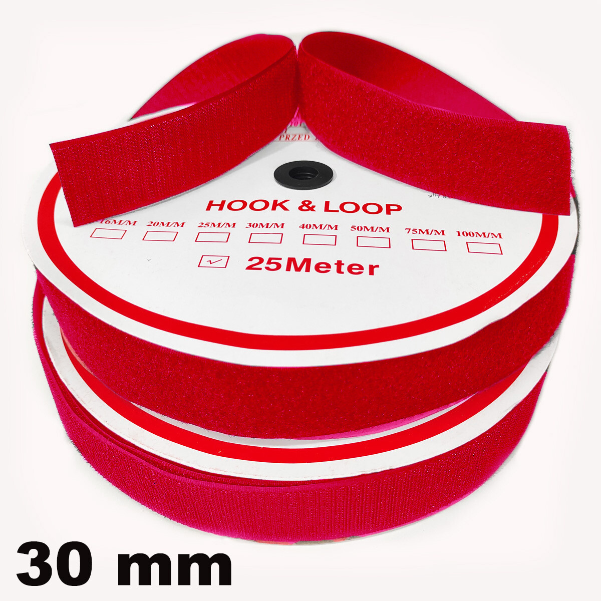 Pásik so suchým zipsom, set háčika a slučky, farba Červená 30 mm, balenie 25 m