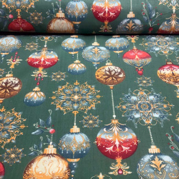 Vianočný vzor bavlnenej látky Vianočné Gule na Zelenom, metráž 160 cm