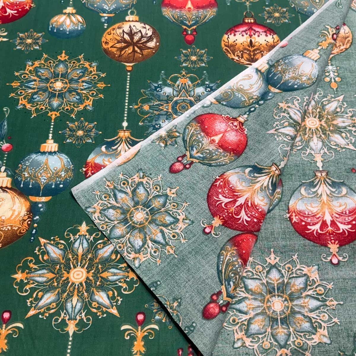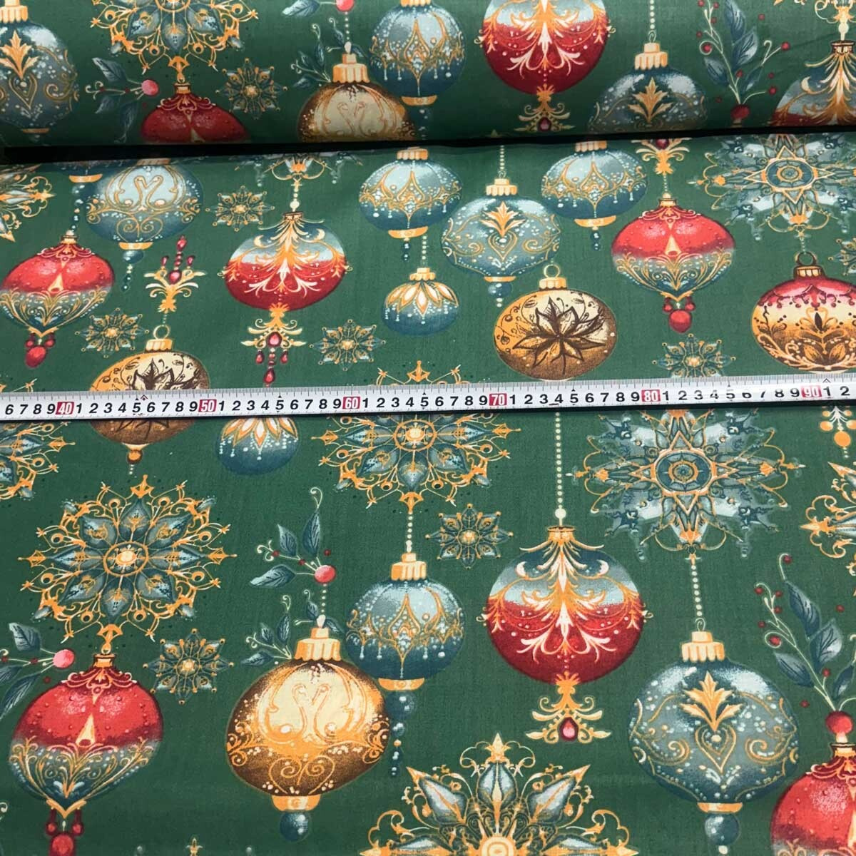Popis Vianočný vzor bavlnenej látky Vianočné Gule na Zelenom, metráž 160 cm